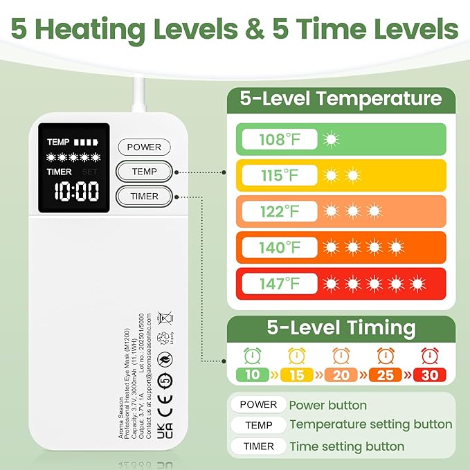 - 【5 Heating Levels & 5 Time Levels】The heated eye mask features five temperature settings ranging from 108℉ to 147℉ and five time options (10, 15, 20, 25, or 30 minutes), providing buyers with a wide range of choices to suit their preferences.