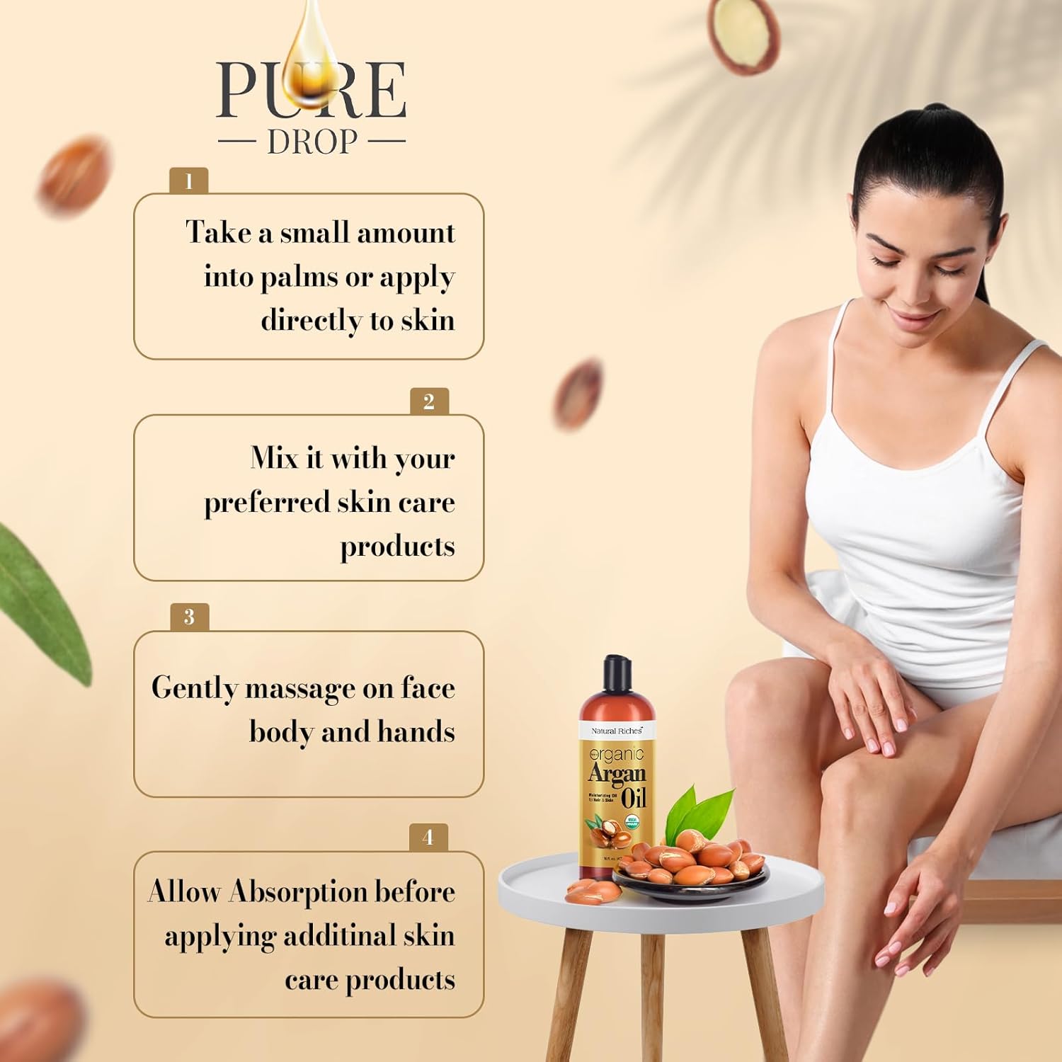 - ORGANIC Argan Oil for Face and Skin: Pamper your skin and body with our nourishing and reviving organic argan oil, delivering deep moisturization and hydration for a smooth and supple complexion. Hydrating argan oil providing intense nourishment and revival for a radiant and youthful look and great skin