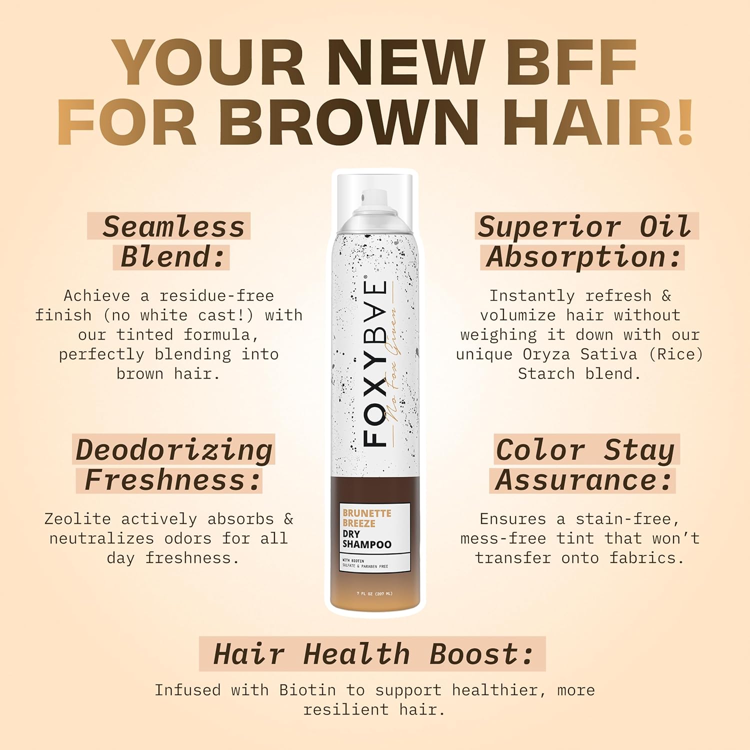 - Tinted Formula for Brunettes: FoxyBae's Brunette Breeze Dry Shampoo is specifically designed as a dry shampoo for dark hair, blending seamlessly without leaving any white residue, making it the best dry shampoo for brown hair.
