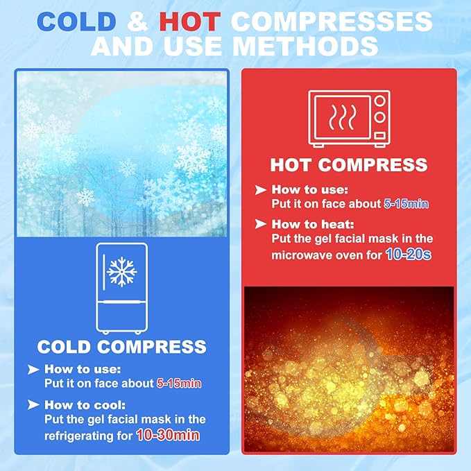 - 👩【Applications and Effects】Cold hot gel eye mask can reduce dark circles,swollen eyes,puffy eyes,dark circles,eye bags,muscle aches,relieve stress,improve sleep and eye beauty care.The open-hole decompression design is suitable for use at work,for eye and before sleeping.