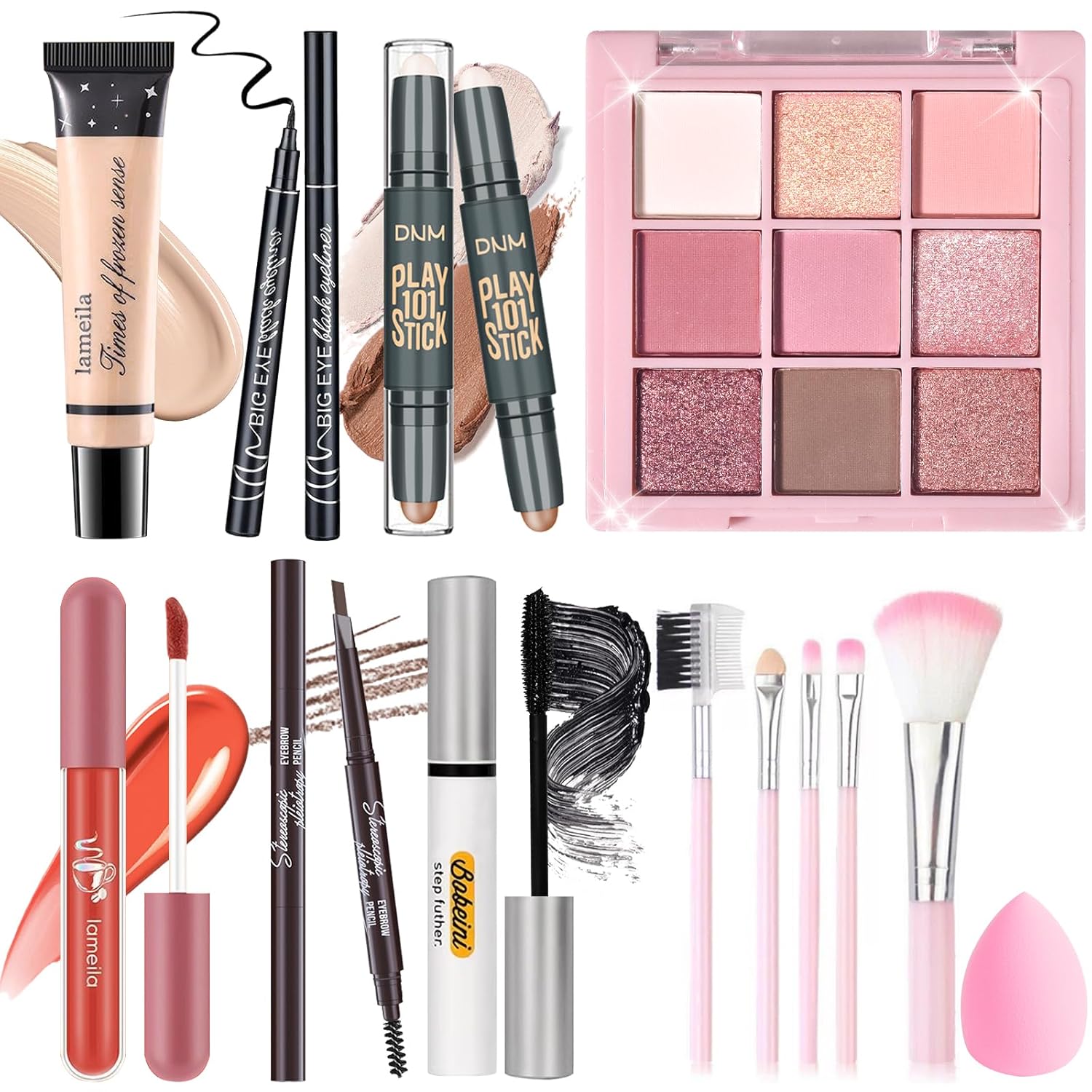 - [ Makeup Set] The ideal starter makeup kit includes 9 colors eyeshadow palette, dual-ended counter and highlighter stick, full coverage liquid foundation, dual-ended eyebrow pencil, eyeliner, waterproof mascara, lip gloss, 5 PCs makeup brushes set, makeup sponge. All women’s makeup essentials are included