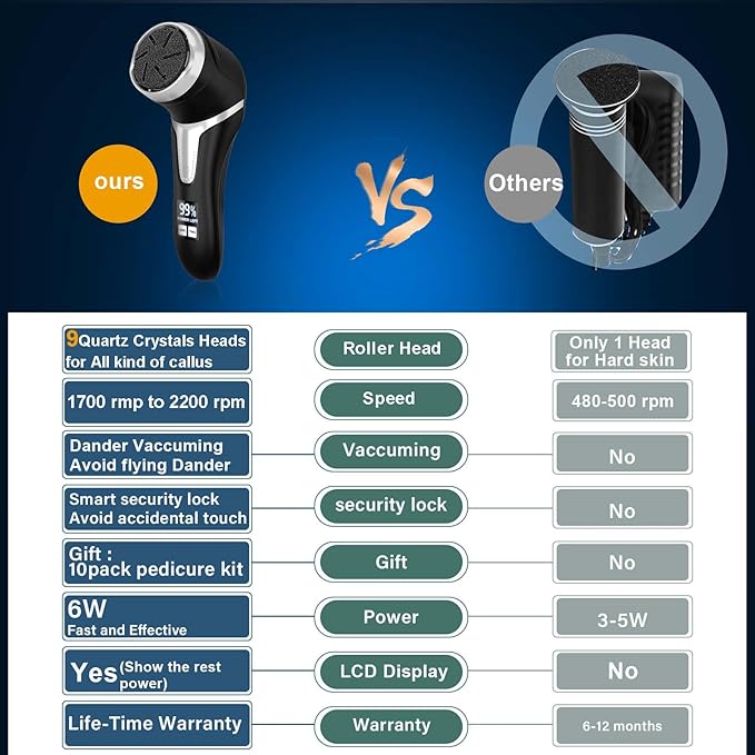 - Pedicure kit with 9 Grinding Head, 2 Speed, with VACUUM ABSORPTION----- 9 Quartz Crystals Removable Roller Heads and 2 Speed Correspond to the roughness required to remove the calluses on the feet. UPGRADE powerful callus remover with dander vacuum cleaner quickly sucks away foot scraps, cle.an and hygienic, and sucks while grinding. dust-free, and foot scraps will not be scattered in air or floor, an essential home pedicure kit for people who has cleanliness.