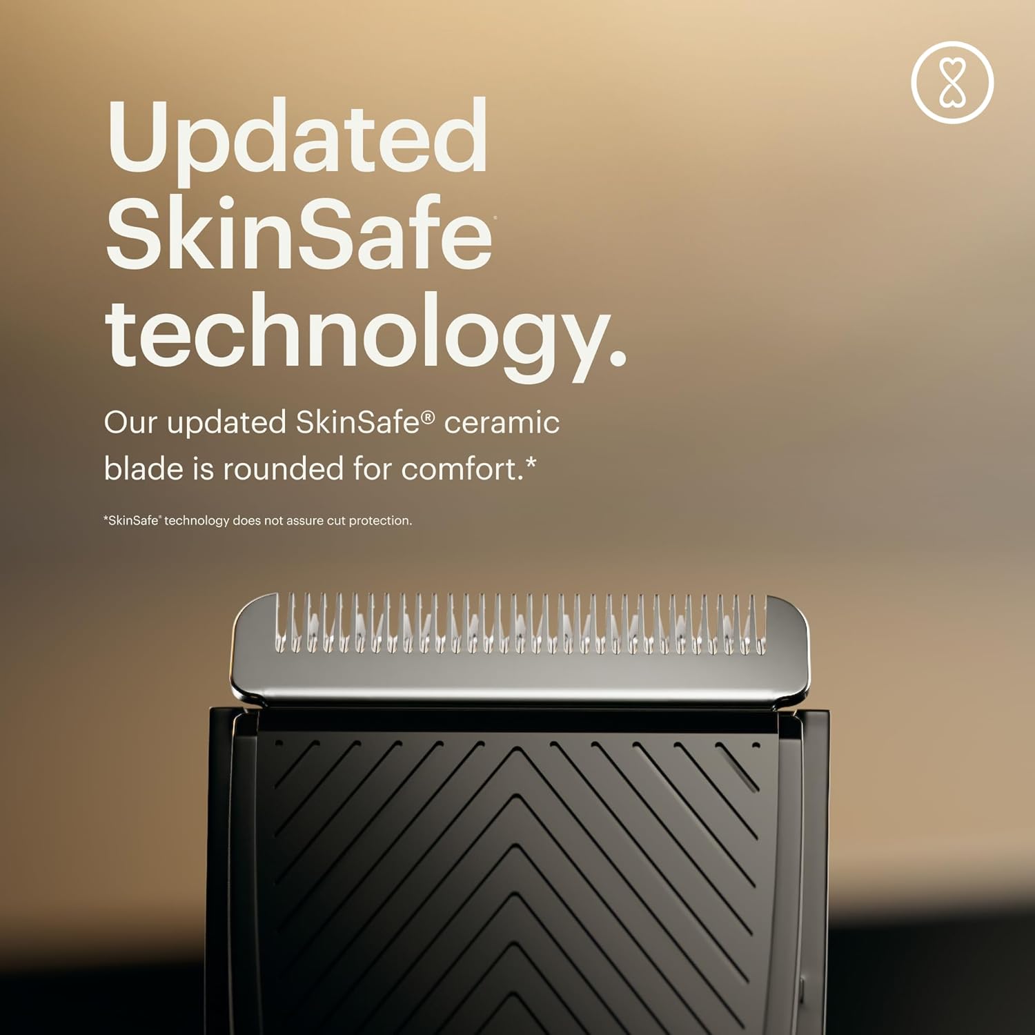 - SKINSAFE TECHNOLOGY: Our updated SkinSafe ceramic blade is rounded for comfort with a built-in guard designed to help reduce nicks and cuts. Included are two adjustable comb attachments that allow you to trim from 2-12 mm. *SkinSafe technology does not guarantee cut protection.