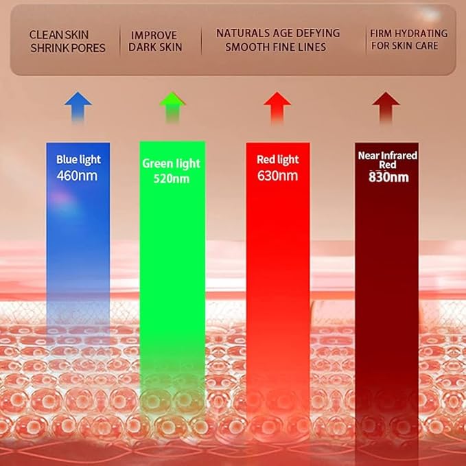 - 1.Comprehensive Light Therapy: Combines 7 clinically-studied LED wavelengths (Red, Blue, Green, Purple, Yellow, White) + Near Infrared Red Light for targeted skin concerns—anti-aging, acne reduction, collagen boost, inflammation relief, hydration, and cellular repair.