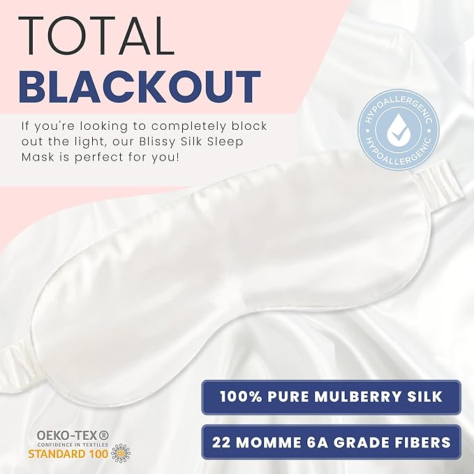 - TOTAL BLACKOUT - If you're looking to completely block out the light, our Blissy Silk Sleep Mask is perfect for you! Made with 100% pure Mulberry silk and 22 momme 6A grade fibers, this mask will keep the light out and help you get a good night's sleep.