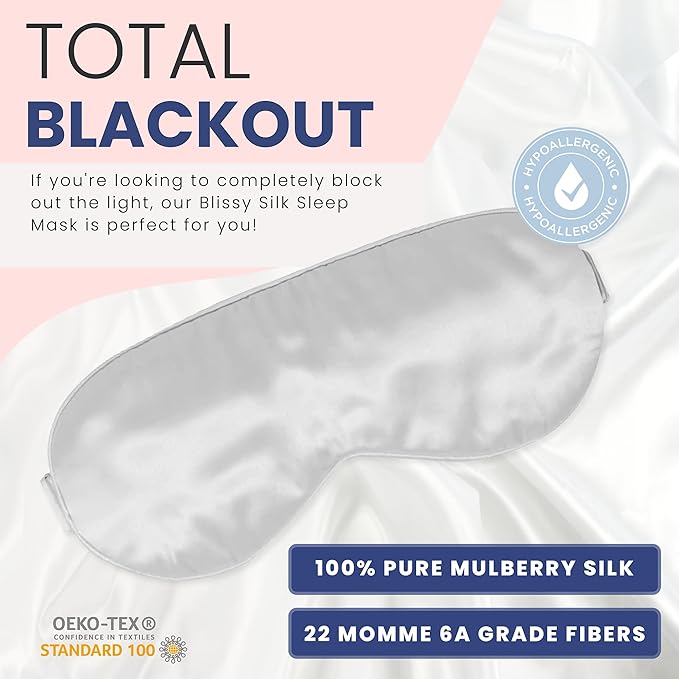 - TOTAL BLACKOUT - If you're looking to completely block out the light, our Blissy Silk Sleep Mask is perfect for you! Made with 100% pure Mulberry silk and 22 momme 6A grade fibers, this mask will keep the light out and help you get a good night's sleep.