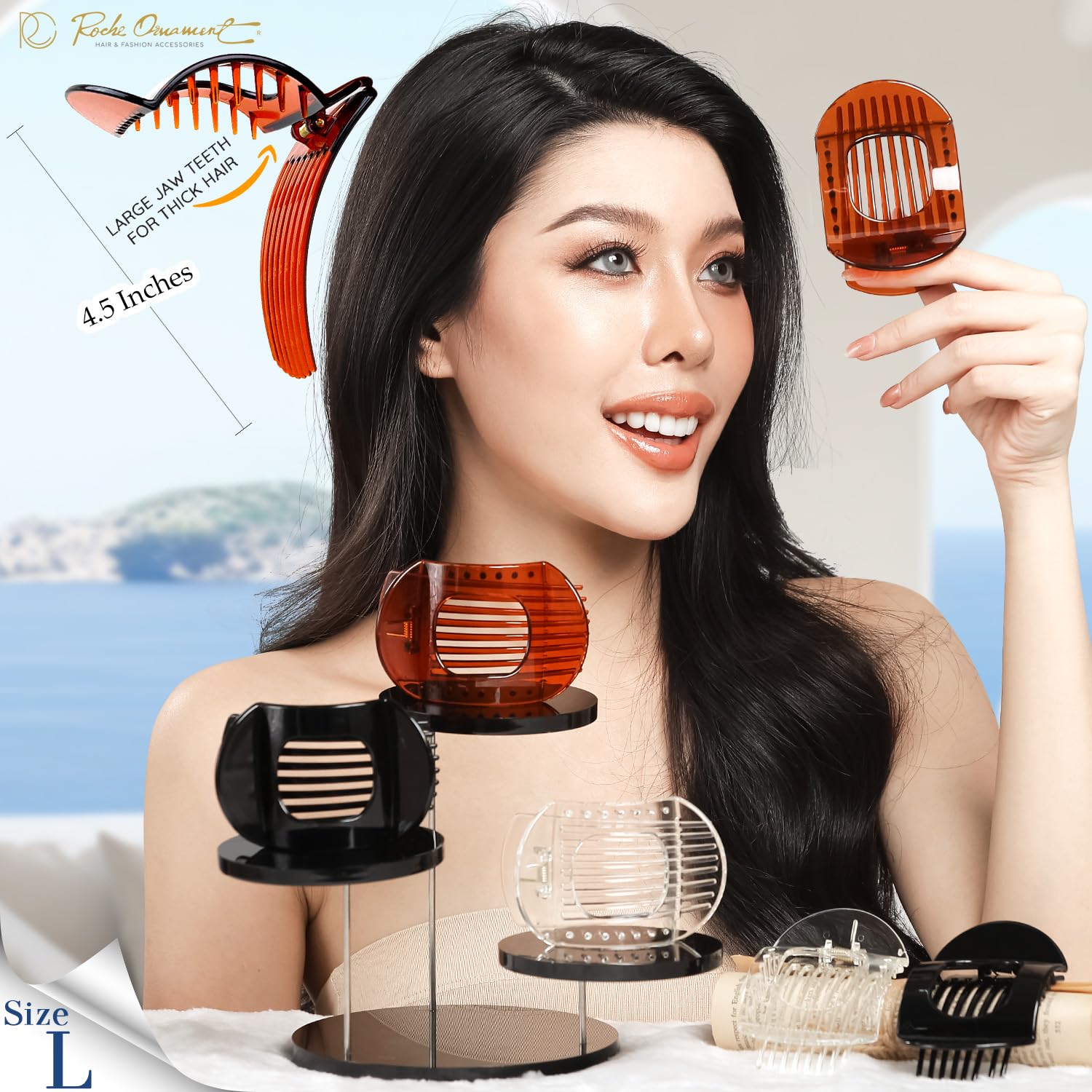 RC ROCHE 6 Pcs Flat Claw Hair Clips for Women Thick Hair French Round Duckbill Square Secure Strong Hold Grip Clamps Barrettes Curved No Slip No Crease Styling Cute Jumbo XL, Large Clear Brown & Black
