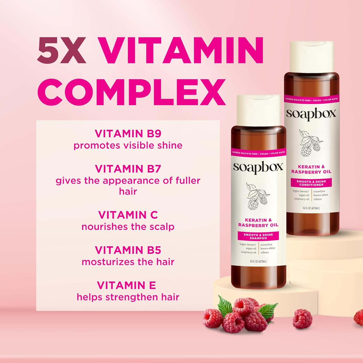 - KERATIN SHAMPOO AND CONDITIONER bring a luxurious touch to your daily routine. Vegan keratin and argan oil work together to tame frizz, giving you smooth, glossy hair. Raspberry and Vitamin E help maintain a smooth finish with a locked-in shine. Our formula is gentle enough for all hair types for men and women.