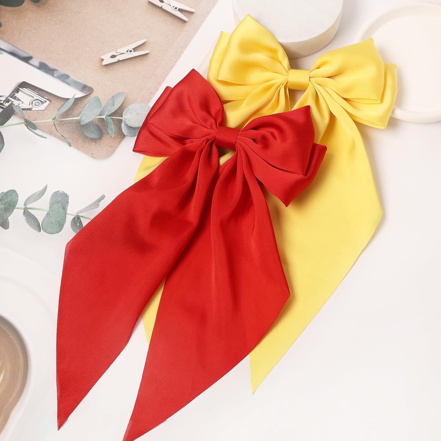 - Hair bows for women set of 3pcs includes black hair bow, red hair bow, yellow hair bow.Made with very high-quality satin fabric tied in a bow with an alligator clip. It is about 6.5 inch*10.6 inch in length and width