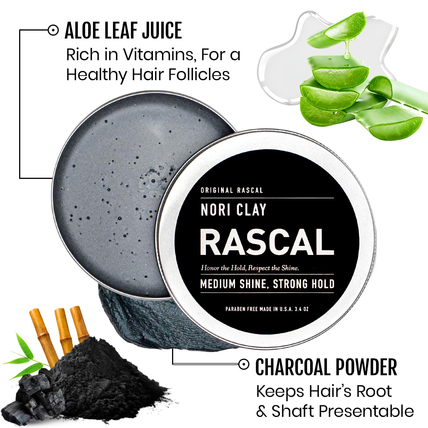 Rascal Nori Clay - Hair Styling Clay for Medium Shine & Strong Hold, Cruelty-Free, Paraben-Free, Made in USA, Ideal for All Hair Types, Made with Charcoal Powder, Aloe Leaf Juice, & Beeswax - 3.4 Oz