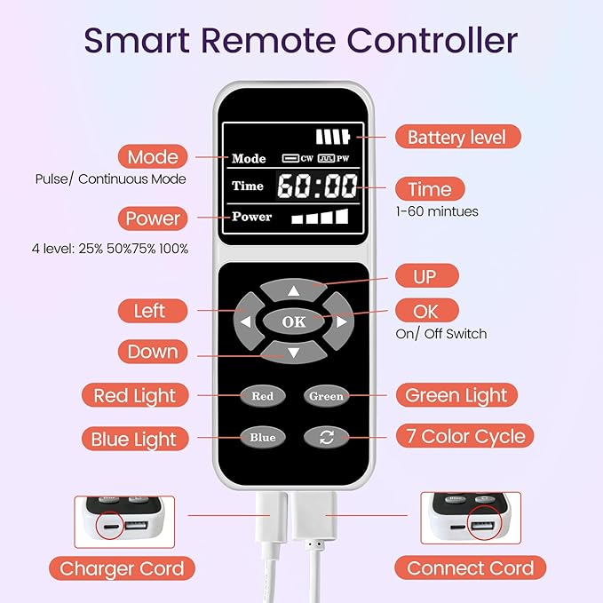 - ๐Multi-functional Led Mask Skincare: Power: 25% 50% 75% 100%, 4 levels adjustable; Time: 1 to 60 minutes adjustable; Mode: CW-continuous wave and PW-pulsed wave at 50Hz(There is evidence proven that PW is superior to CW for most application). Plug the infrared face mask into the power cord, long press OK for 2-3 seconds to turn on/off device, quick tap of OK to start/pause device, Up/Down to choose Mode/Time/Power. Press the Red/Green/Blue for 7 colors; Cycle for choosing 8 different light modes.