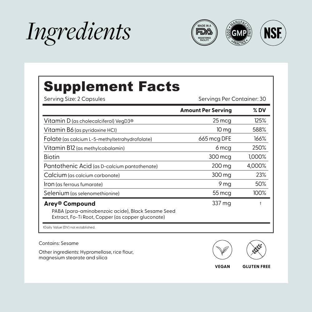 - EASY 2-CAPSULE DAILY ROUTINE — Take 2 capsules daily with food for best results. Flavorless and with no aftertaste. Pairs seamlessly with Arey’s To The Root scalp serum for complete inside-out care targeting greying and thinning hair.