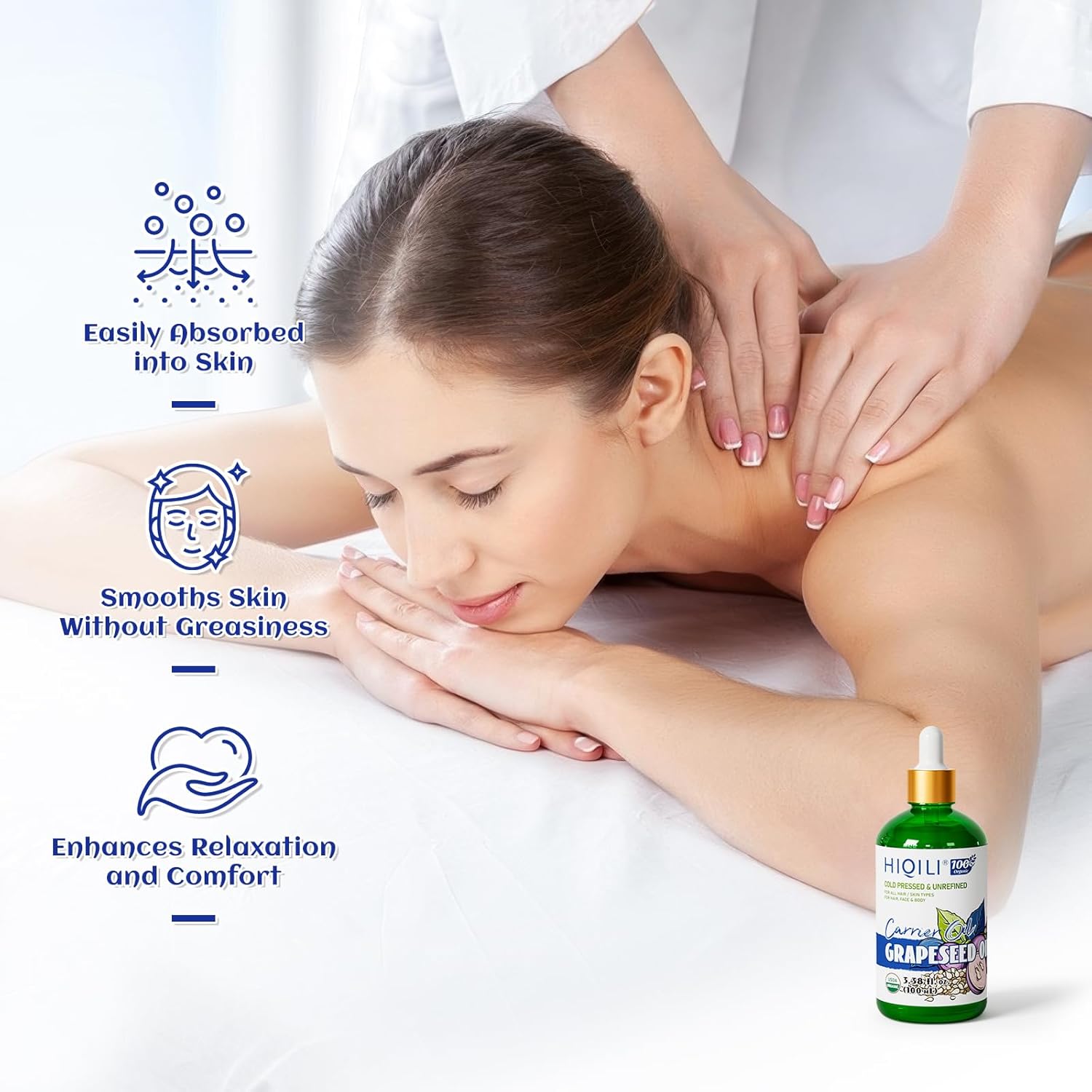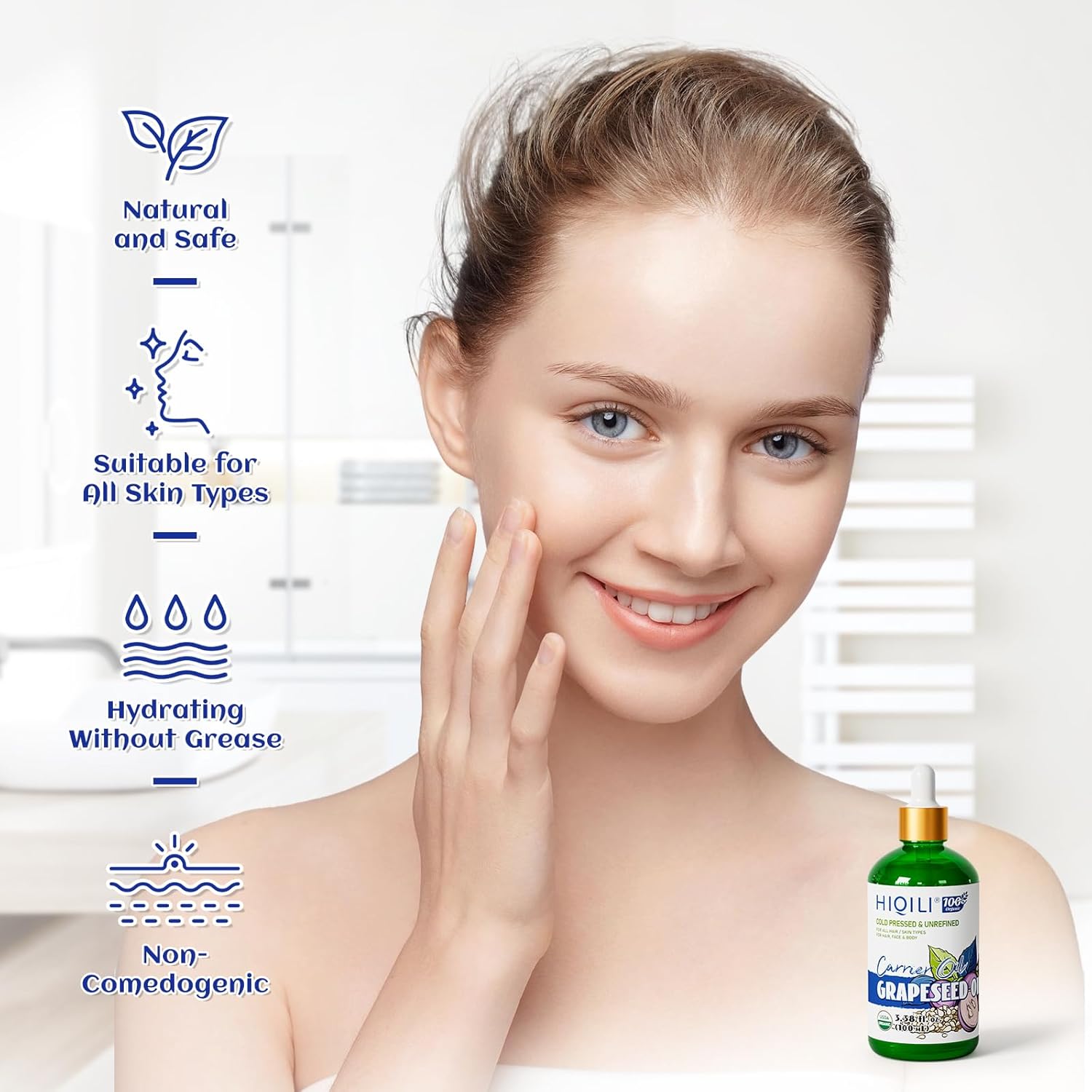 HIQILI 3.38 Fl Oz Organic Grapeseed Oil for Hair, for Skin, Carrier Oil for Essential Oils Mixing, 100% Pure & Natural-100ML
