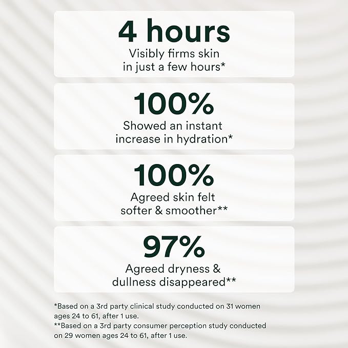 - Clinically Shown Firming: Our ultra-hydrating, lightweight body lotion is scientifically shown to visibly firm skin in just 4 hours. Packed with clinically shown ingredients including undaria seaweed and hyaluronic acid, to deliver lasting hydration for radiant, revitalized skin.