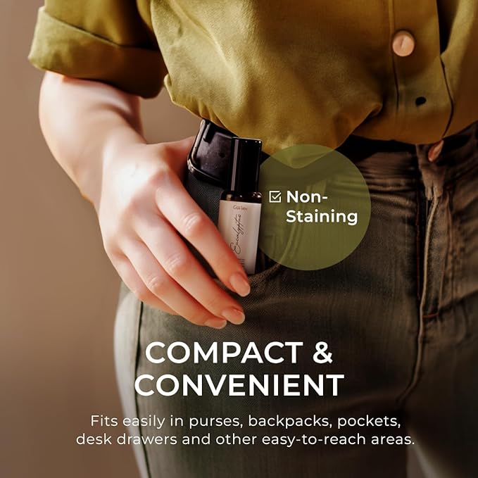 - Portable wellness on-the-go: Enjoy the convenience of portability with our eucalyptus roller ball, allowing you to apply it anywhere and anytime as needed. Whether at home, work, or on travel, our roll-on ensures relaxation at your fingertips.
