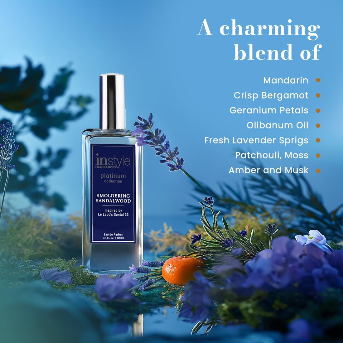 Instyle Fragrances, Platinum Collection, Smoldering Sandalwood, Inspired by Le Labo’s Santal 33, Unisex Eau de Parfum, CLEAN, Vegan, Paraben-Free, Never Tested on Animals, 3.4 Fluid Ounces