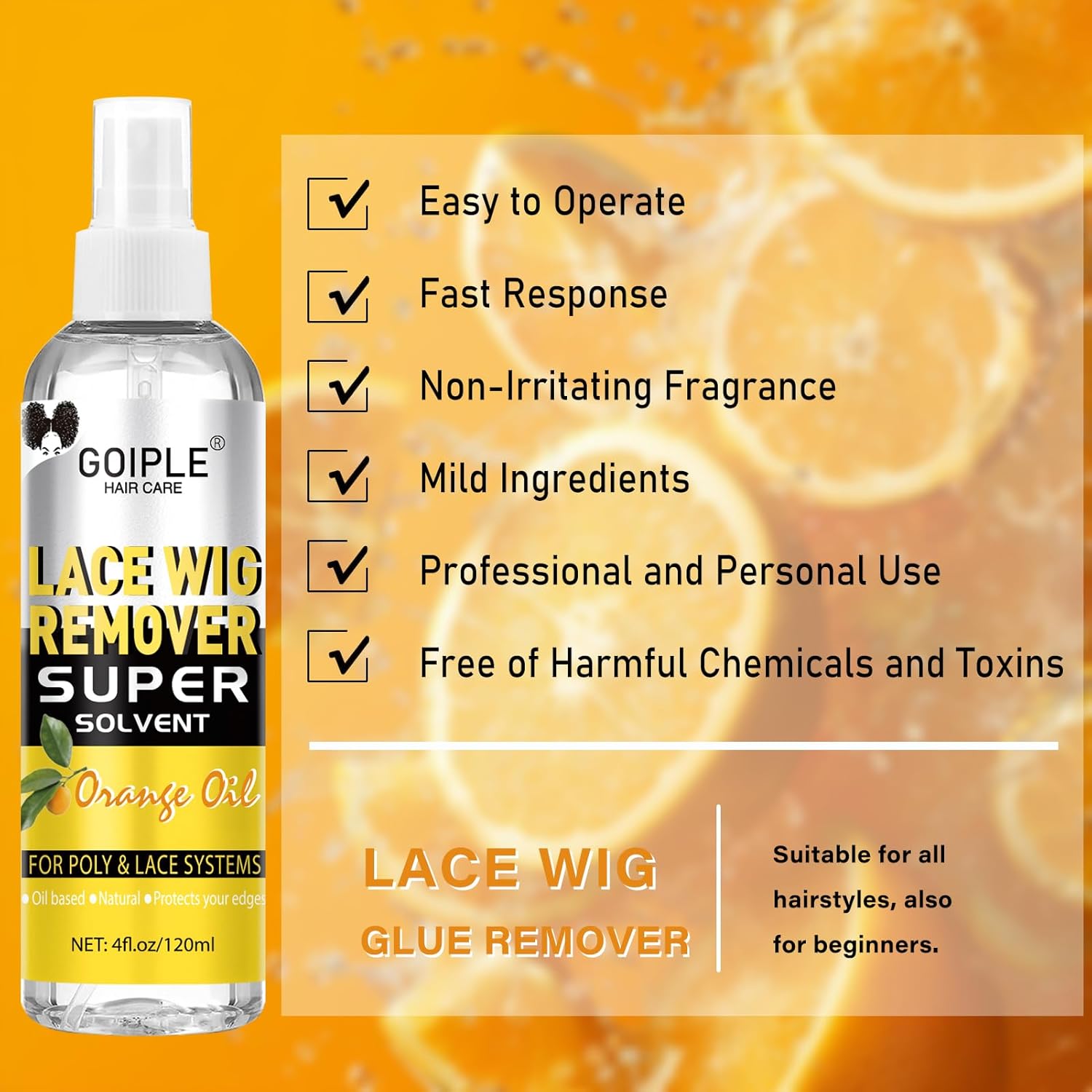 - MILD FORMULA: Our amazing lace removal spray formula is mild and it is infuse citrus extracts, coming from orangeand lemon, no harmful chemicals added, no harm to the skin, you can use the spray adhesive remover to easily remove the wig