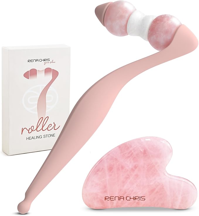 Rena Chris Facial Roller and Gua Sha Set - Jade Gua Sha Facial Tools & Face Roller with Aluminum Alloy Handle and 316 Stainless Steel Shaft for Puffiness Reducing,Skin Care Gift for Women