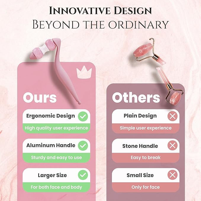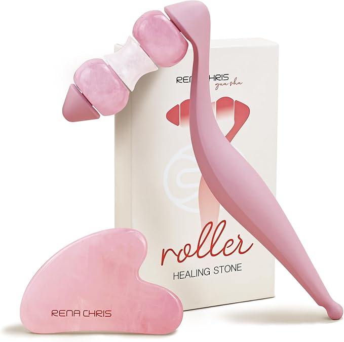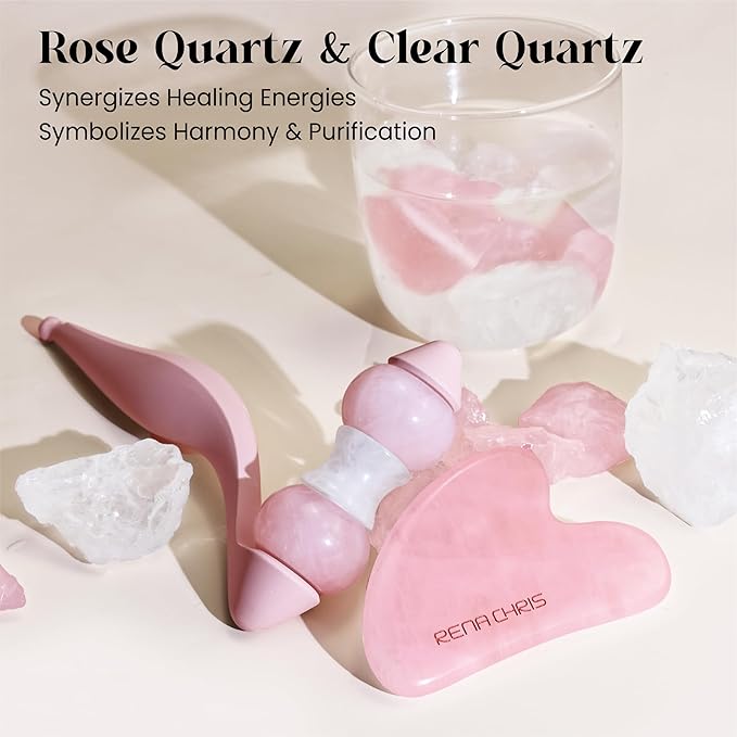 - Not Only for Face Massage: crafted from natural rose quartz and clear quartz for calming energy. This Jade Roller Set provides massage for face, eyes and neck with added acupressure function; specially designed curved handles fit comfortably in your hand; The largest size also provide massage to other parts of your body