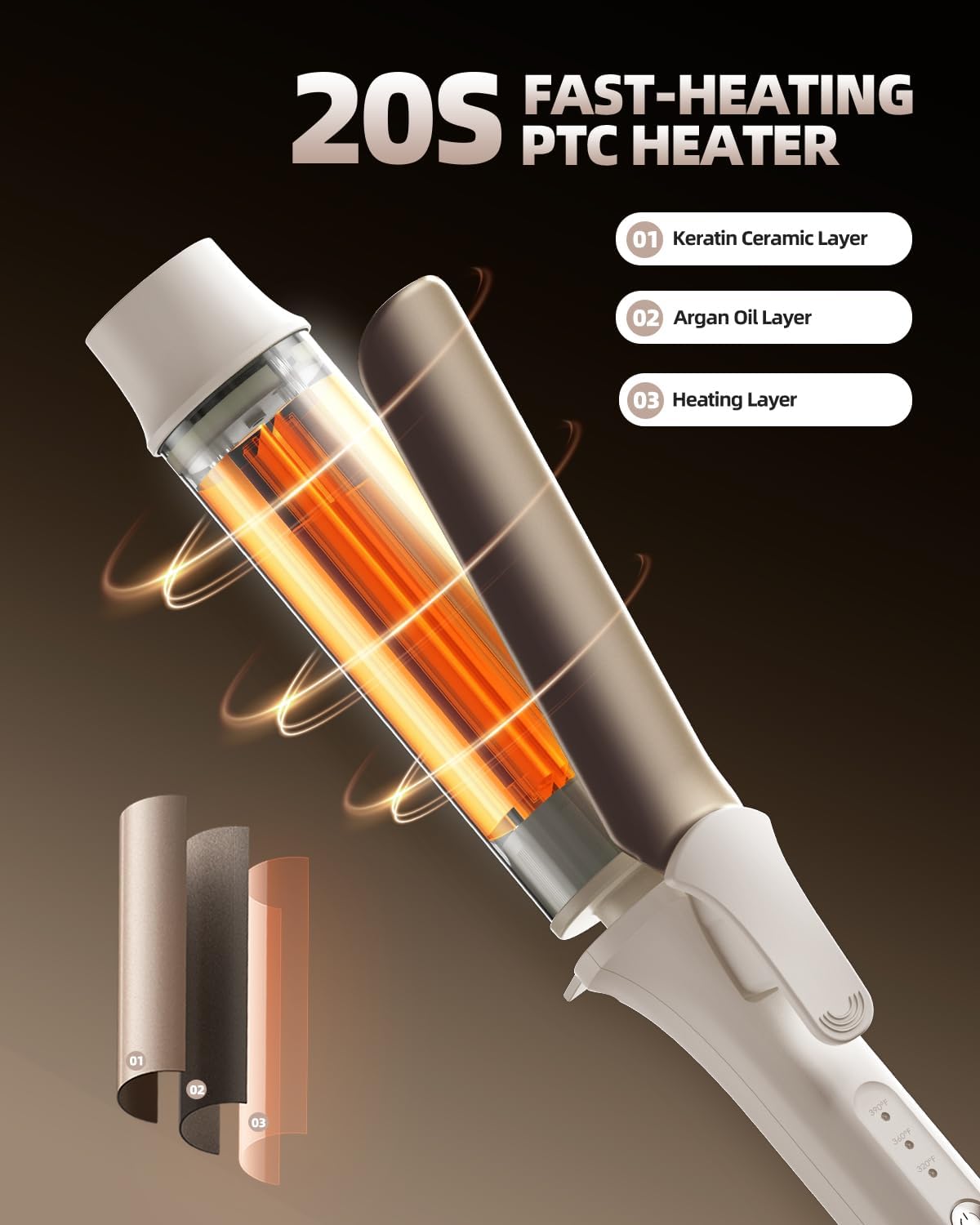 - FAST 30S HEATING: Our curling iron features advanced PTC heating technology with multiple built-in PTC heating elements that heat up to 300°F in just 30S, and three curling modes to get you started on your styling journey