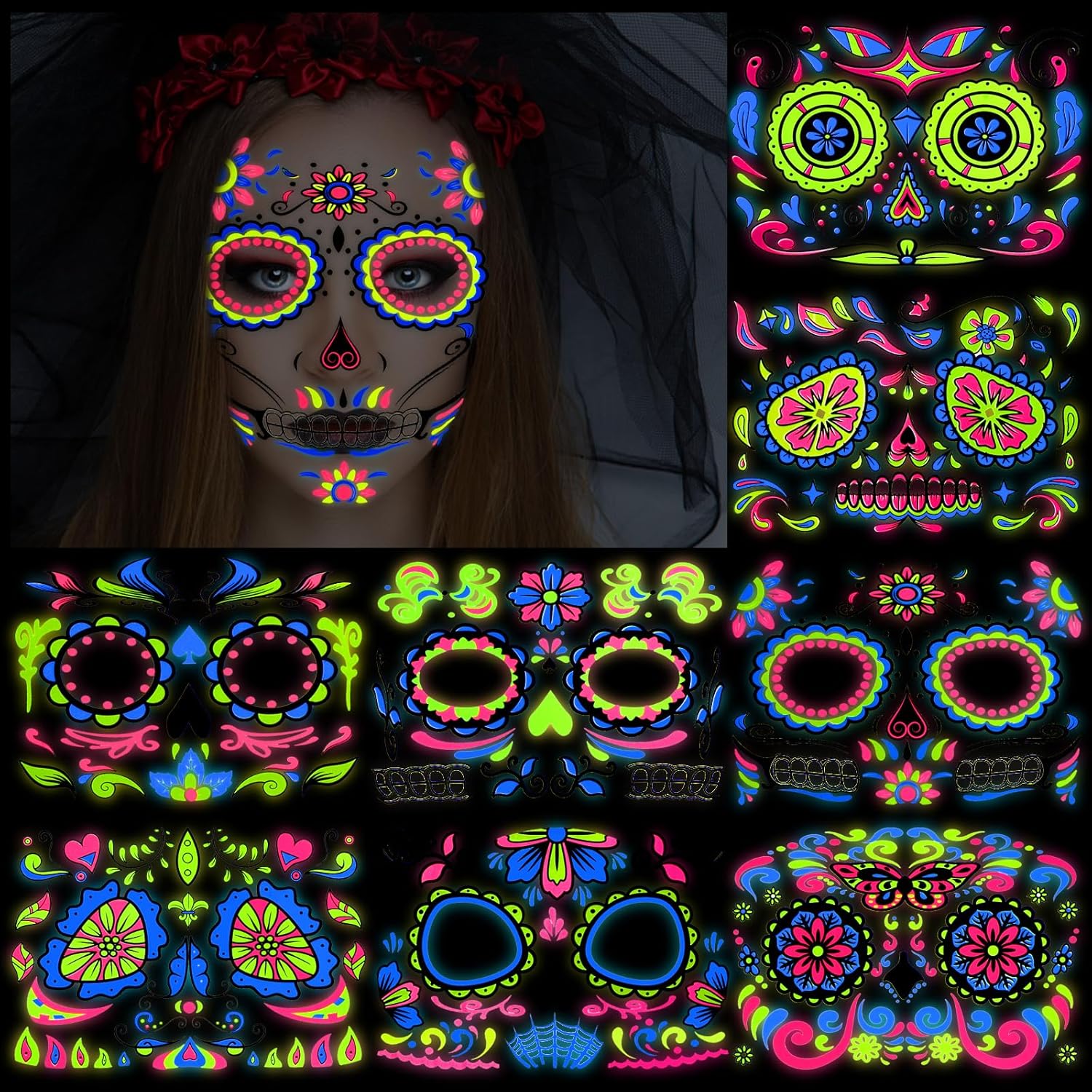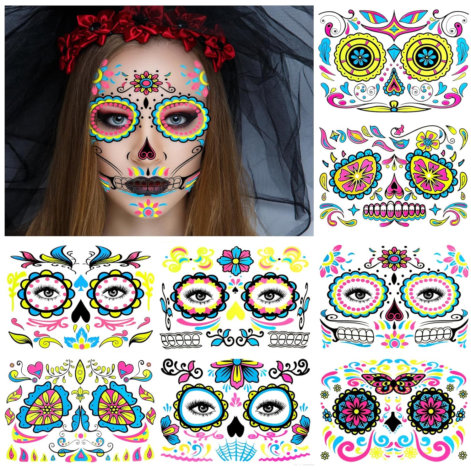 - Glow UV Neon Day of The Dead Face Tattoo Set: You will receive 8 sheets Dia De Los Muertos Face Mask temporary tattoos stickers for men and women facial art decorations! Each Face Mask Tattoos flower skull temporary tattoo stickers measures 6.7 x 4.7 inches/17 x 12cm, look different and attractive on Halloween Day of The Dead parties!