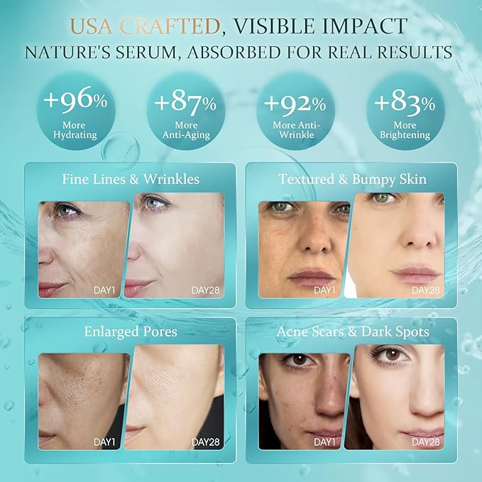 - Visible Results: Users have reported significant improvements with 92% noticing a reduction in the appearance of wrinkles and 95% seeing a significant hydration. The serum enhances skin strength and moisture, giving a radiant and youthful appearance.