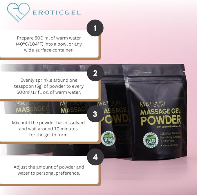 - Sustainable and Practical Packaging: Our Matsuri Massage Gel Powder now comes in resealable sachets for enhanced sustainability and convenience. Made with vegan ingredients and is free from Parabens and Glycerin, ensuring you enjoy a safe and nourishing massage experience that is kind to both your skin and the environment.