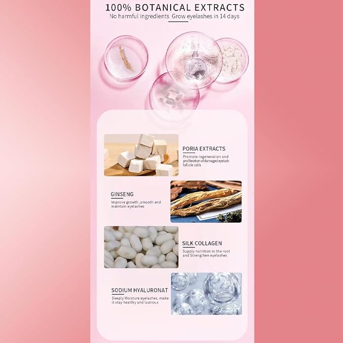 - Formulated with Natural Ingredients: The serum is enriched with botanical extracts such as Poria Extracts, Ginseng, Silk Collagen, and Sodium Hyaluronate to nourish and improve the growth of your lashes.