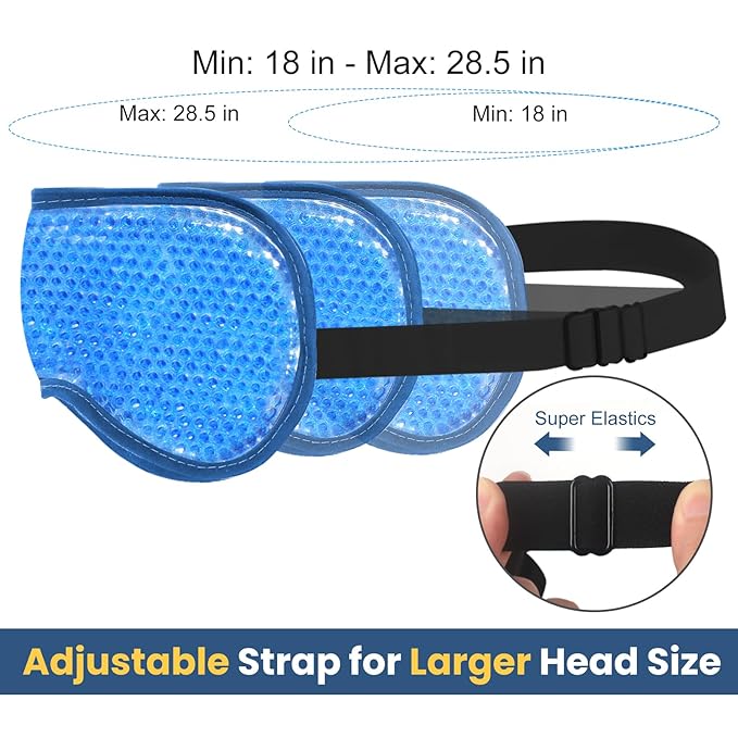 - 【Adjustable Soft Elastic Strap, Comfortable & Suits Any Head Size】BeeVines XL ice eye mask for puffy eyes features a soft, adjustable elastic head strap that does not move or fall off while you are using the gel eye mask. The elastic strap of this cooling eye mask is better as it never messes your hair & is more durable as a Velcro always tangles your hair. Our frozen cold compress pack for puffiness is perfectly fit any head shape & size (18 in to 28.5 in) and suit both adults & kids.