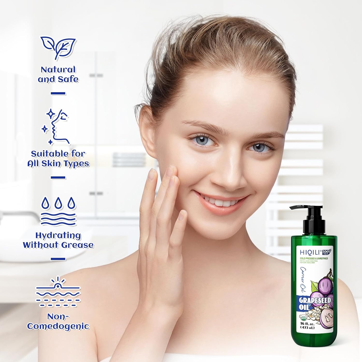 HIQILI 16 Fl Oz Organic Grapeseed Oil for Hair, for Skin, Carrier Oil for Essential Oils Mixing, 100% Pure & Natural-473ML