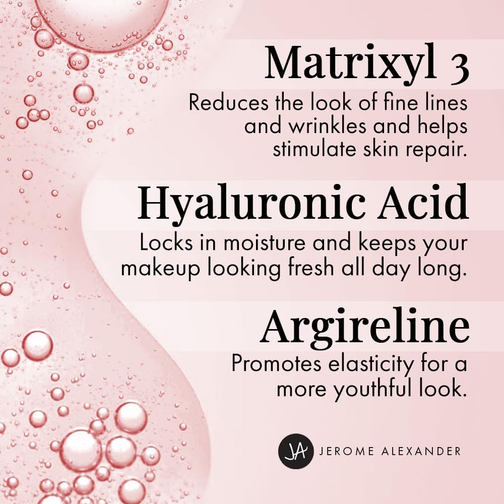 - Argireline and Matrixyl 3000: Reduces lines and wrinkles, relaxes wrinkles, boosts collagen production, elasticity, and stimulates skin repair.