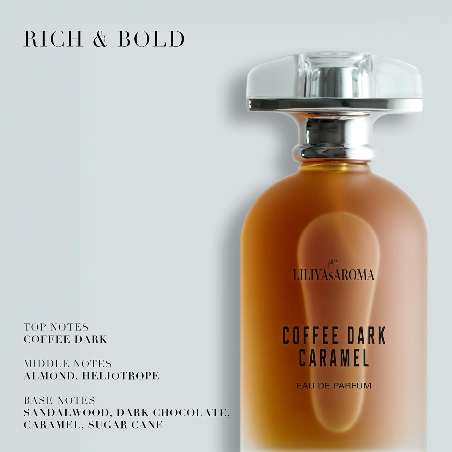 - Sophisticated & Alluring: A perfect balance of warmth and sweetness, featuring top notes of coffee dark, heart notes of almond and heliotrope, and base notes of sandalwood, dark chocolate, and caramel.
