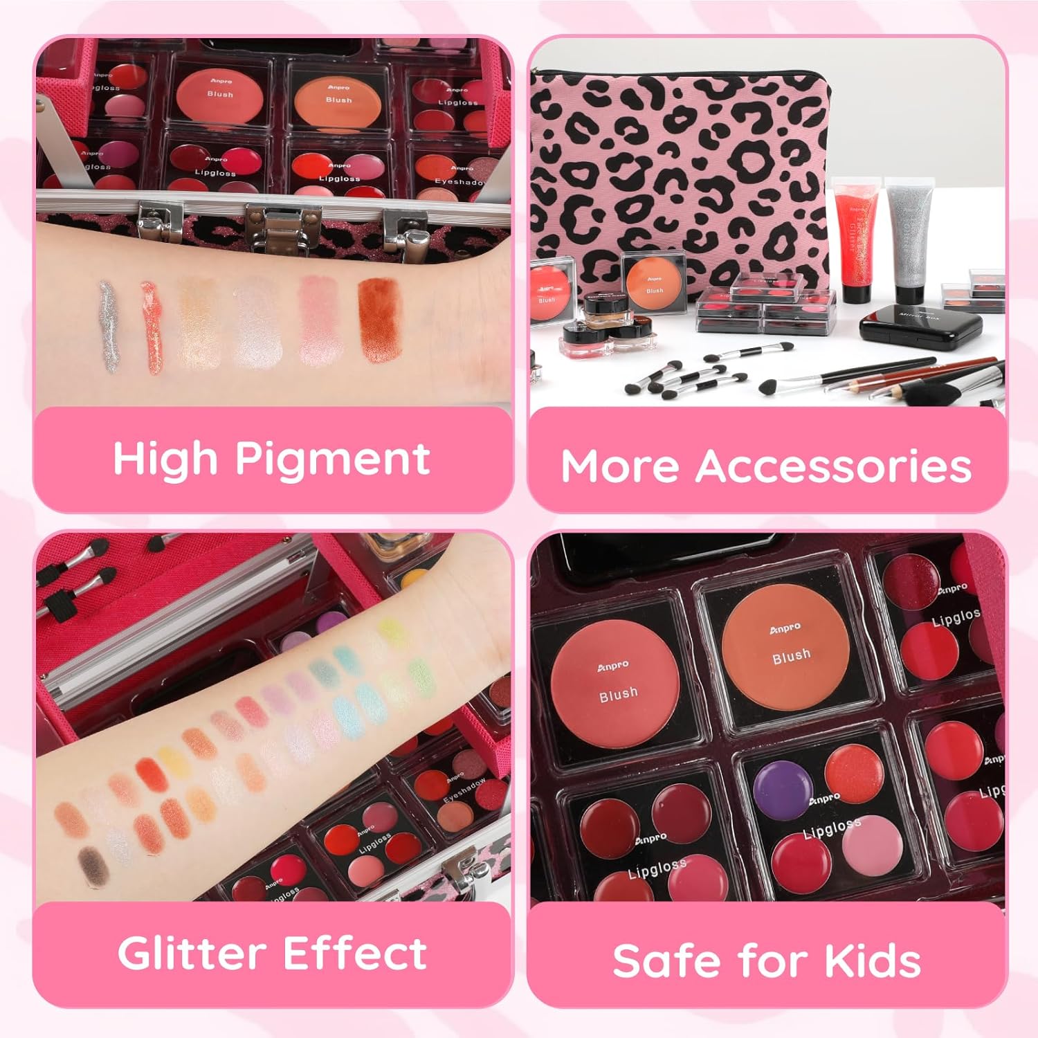 Anpro All-In-One Leopord Double Folding Makeup Carry Case with Pro Teen Makeup Set, Full Starter Kit with Makeup Brushes, Lipsticks, Eyeshadow Palette, Blushes, Glitter Gel, Ideal Present for Girls