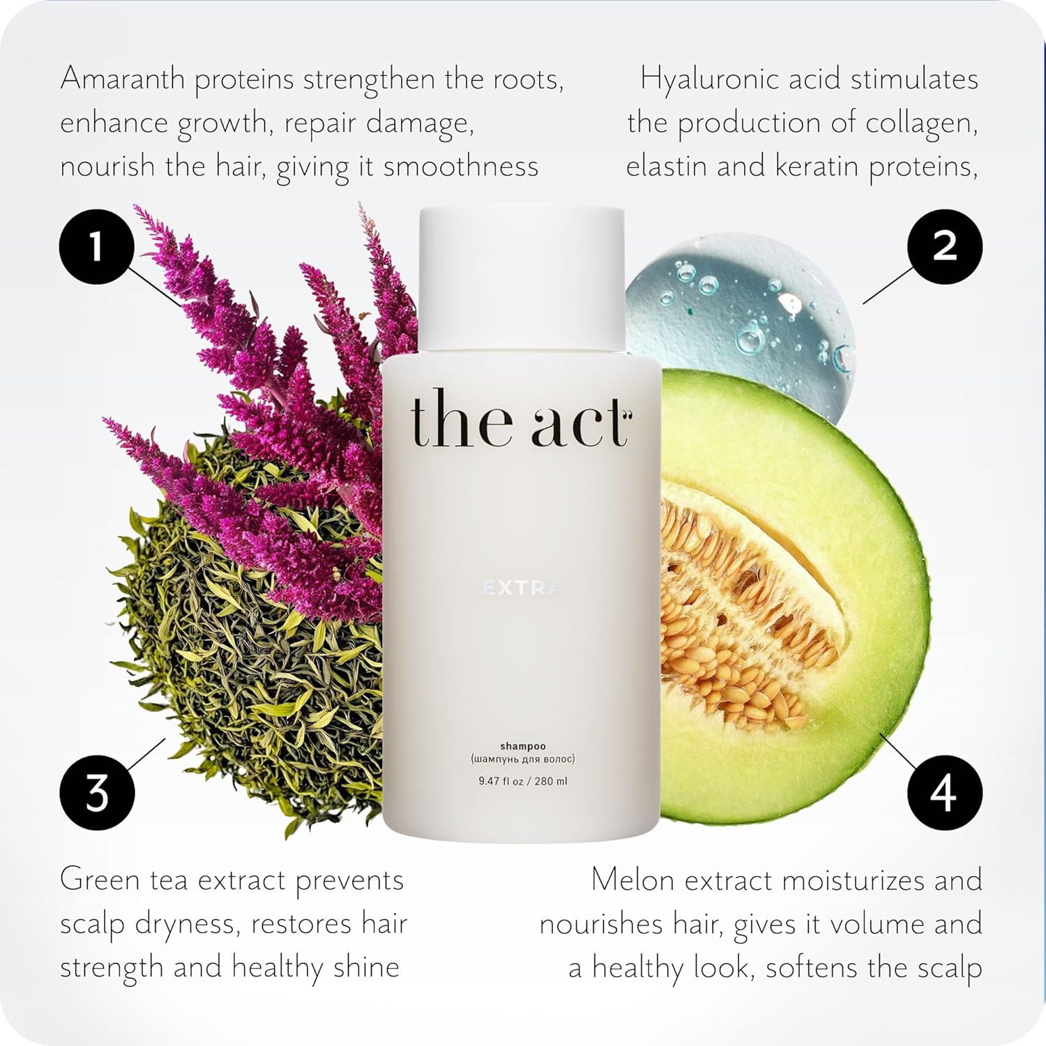 - ๐ฆNourishing Plant-Based Oil Complex: Infused with a blend of valuable plant oils like coconut oil, The Act shampoo strengthens hair from the roots, helping to enhance thickness and density. Castor oil offers protective benefits, helping to "seal" the ends of the hair, minimizing breakage and split ends.