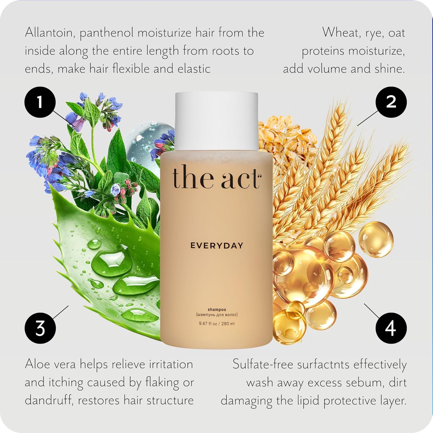 - ๐ฆNourishing and Moisturizing Formula: Infused with proteins from wheat, rye, and oats, The Act hydrating shampoo delivers essential moisture and nutrients to your hair, enhancing volume, shine, and softness. Allantoin and panthenol deeply nourish and hydrate your hair, improving elasticity and flexibility, while aloe vera soothes and helps restore irritated scalp.