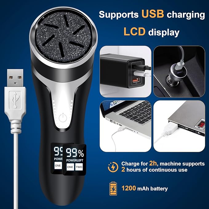 - LCD Power Display and Charging Protection: This electric callus remover has an LCD screen that shows the remaining power of the machine. With charging protection system to ensure charging safety and protect user safety.