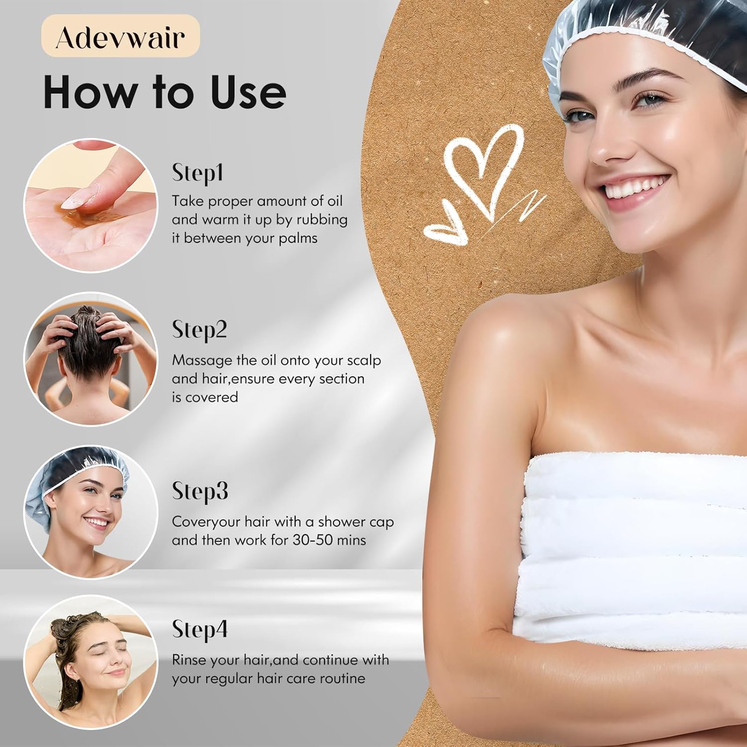 - EASY TO USE: With just one additional step, you can elevate your hair care routine. Simply apply the oil evenly to your hair before washing. It absorbs quickly, within 10 seconds, and works its magic while wrapped in the included shower cap for 30-50 minutes. After rinsing, you’ll enjoy smooth, shiny hair. We provide a spoon and shower cap to make the process even more convenient