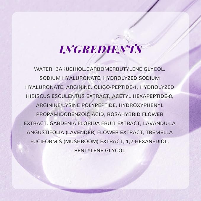 - High-Capacity--Our Bakuchiol serum is riches in Hyaluronic Acid, Peptide, and Mushroom Extract, these high-performance antioxidants are known to prevent signs of premature aging, especially hyaluronic acid deeply penetrate the skin, help bind water and moisture onto the skin, restore skin protein, reduce fine lines, wrinkles, replenish moisture and promote a smooth, youthful complexion.