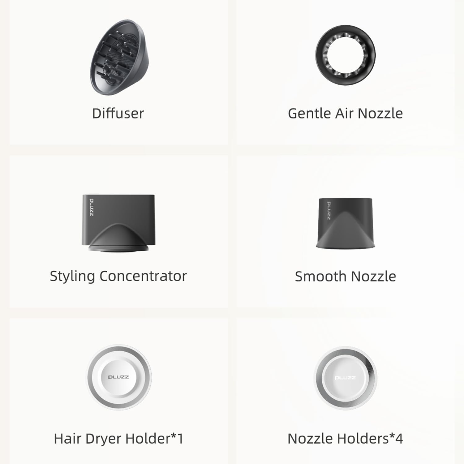- 【Pro Performance, Home Convenience】The PLUZZ Pro meets stylist demands with professional-grade power, yet is easy enough for daily use. The ergonomic grip reduces arm fatigue, and the versatile attachments suit all hair types—from thick curly hair to fine straight hair. A must-have for fast, frizz-free drying!"