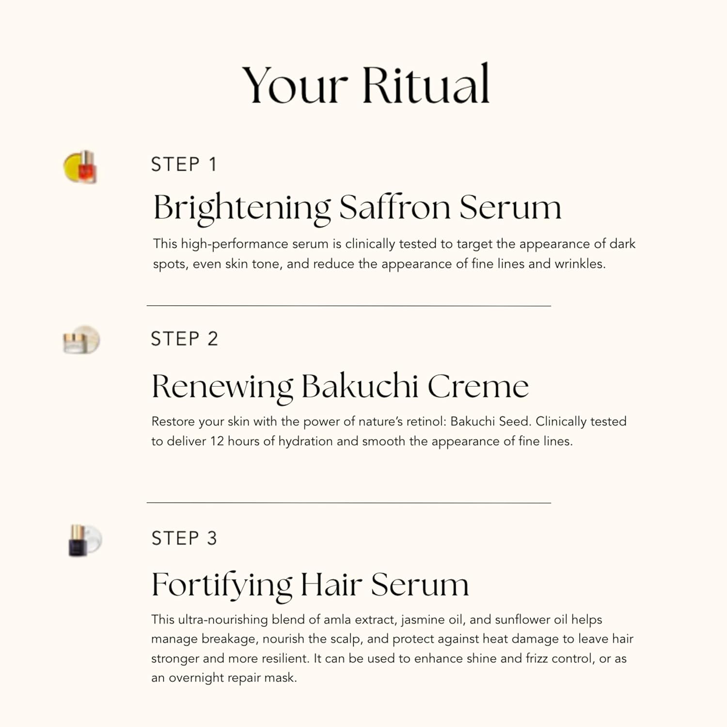 RANAVAT Royal Trio Travel Size Gift Set - Set Includes Brightening Saffron Face Serum, Renewing Bakuchi Face Cream & Fortifying Hair Serum - Clinically Tested Vegan Skincare & Haircare (3 Count)