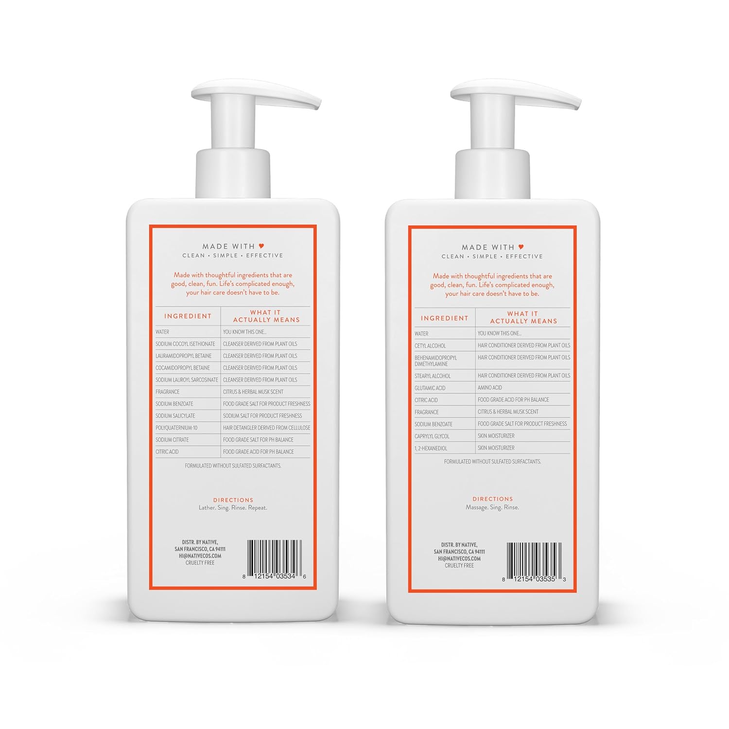 - Naturally Derived Ingredients - Native shampoo and conditioner set contains naturally derived and simple ingredients. Made with just 10 thoughtful ingredients that give strength to your strands such as coconut oil derived cleansers, food grade cleansing salts, and citric acid for pH balance. Free of silicone, sulfated surfactants, paraben, and dyes.