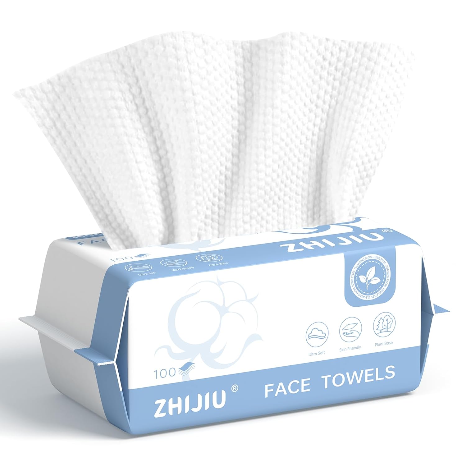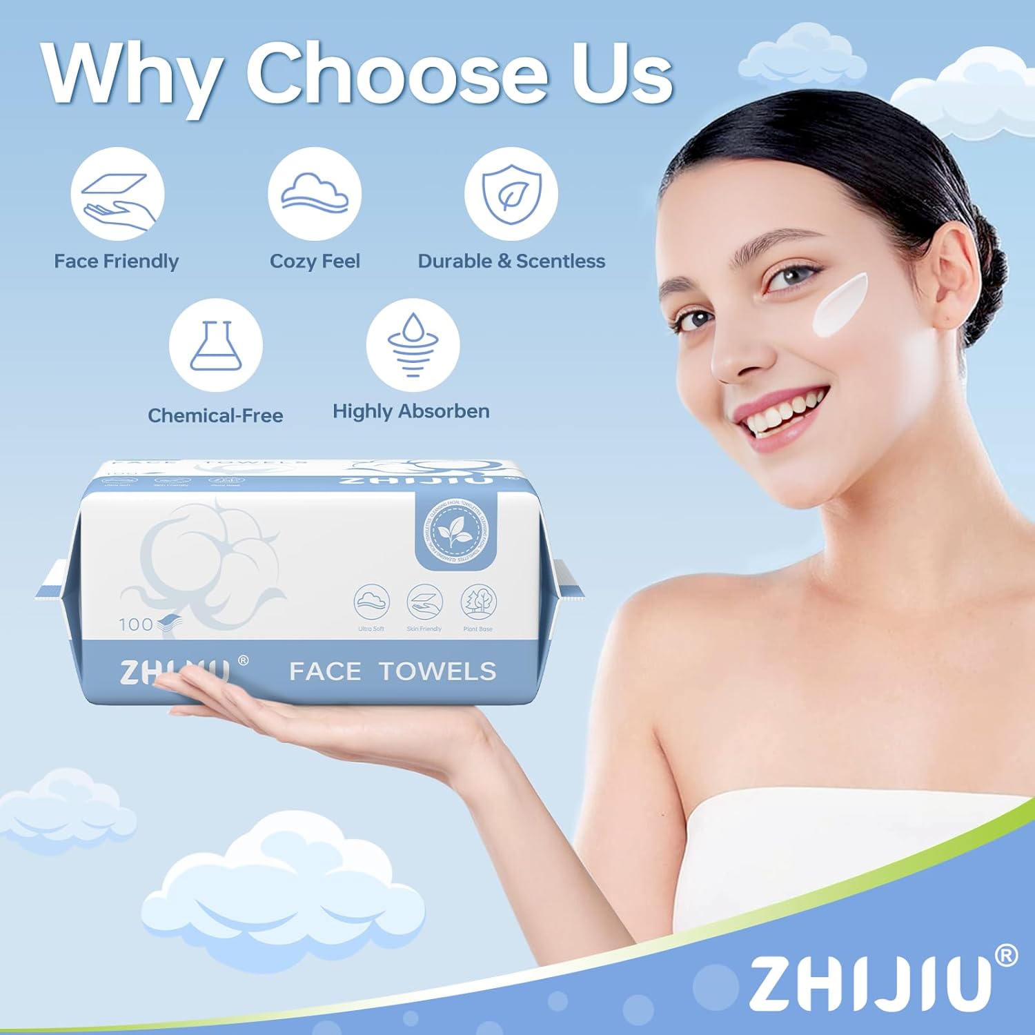 Disposable Face Towels 100 Count, Lint-Free Soft Cotton Facial Dry Wipes,8” x 8” Clean Facial Towels Wash Cloth for Sensitive Skin,Makeup Remover Dry Wipes