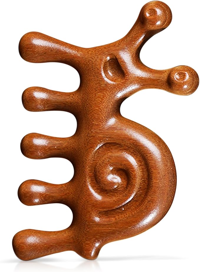 - Snail shaped Design: Experience diverse massages with our Snail shaped sandalwood comb. The five claw end targets your scalp, while the two claw end is perfect for massaging your eyes, face, neck, shoulders, and hands.