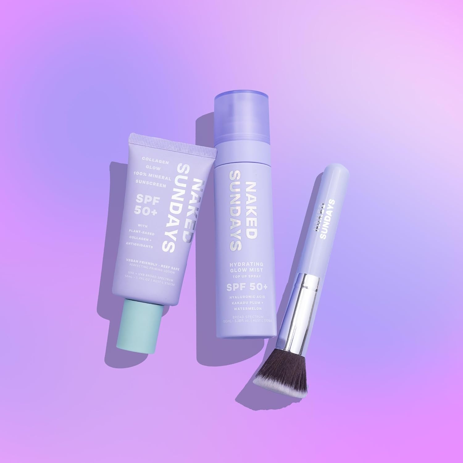 Naked Sundays Daily Sunscreen SPF 50 Best Sellers Trio - 100% Mineral Primer Lotion, Hydrating Glow Setting Spray Mist, and SPF Brush