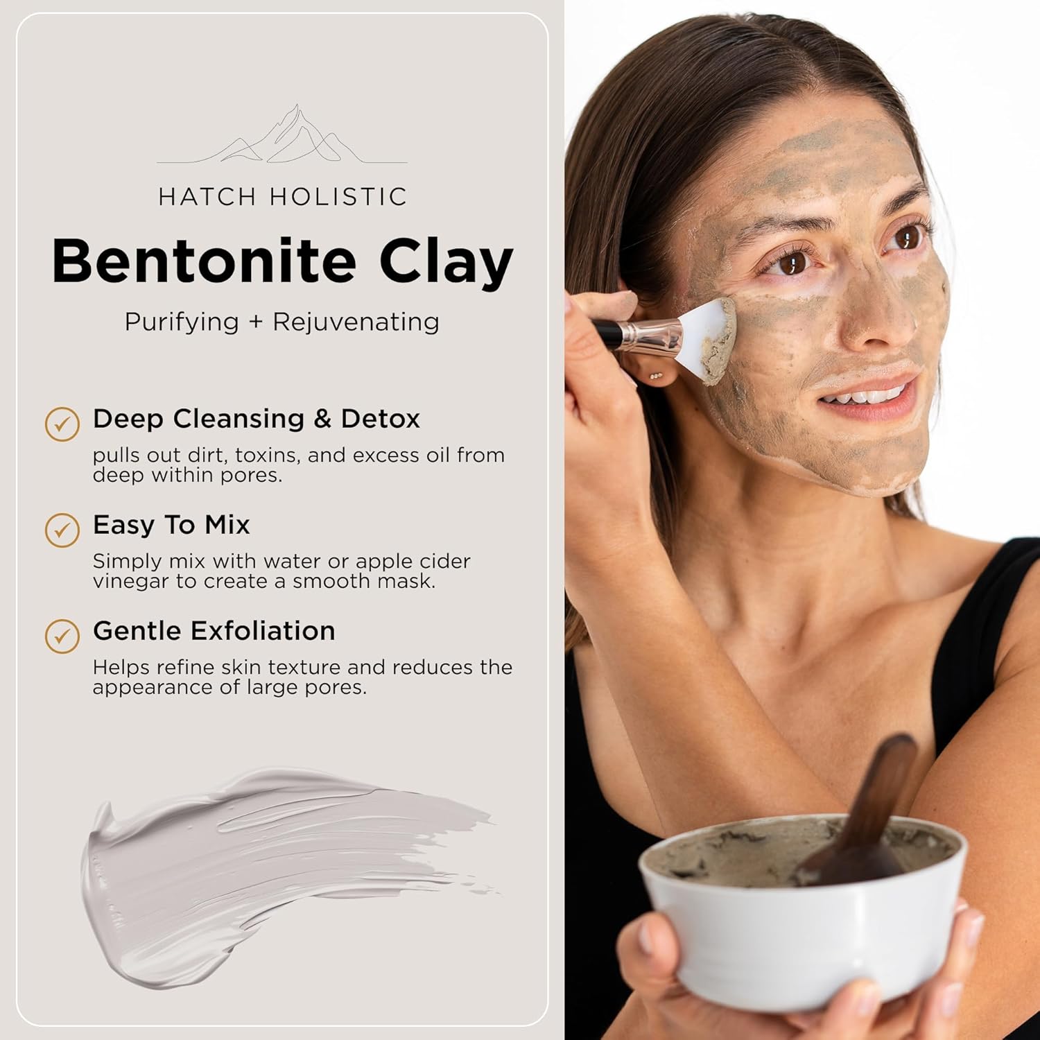 - EASY-TO-MIX MASK – Simply mix this bentonite clay powder with water or apple cider vinegar to create a smooth mask. Apply it to your face, body, or scalp for a deep-cleansing treatment. It dries quickly and rinses off easily for a smooth experience.