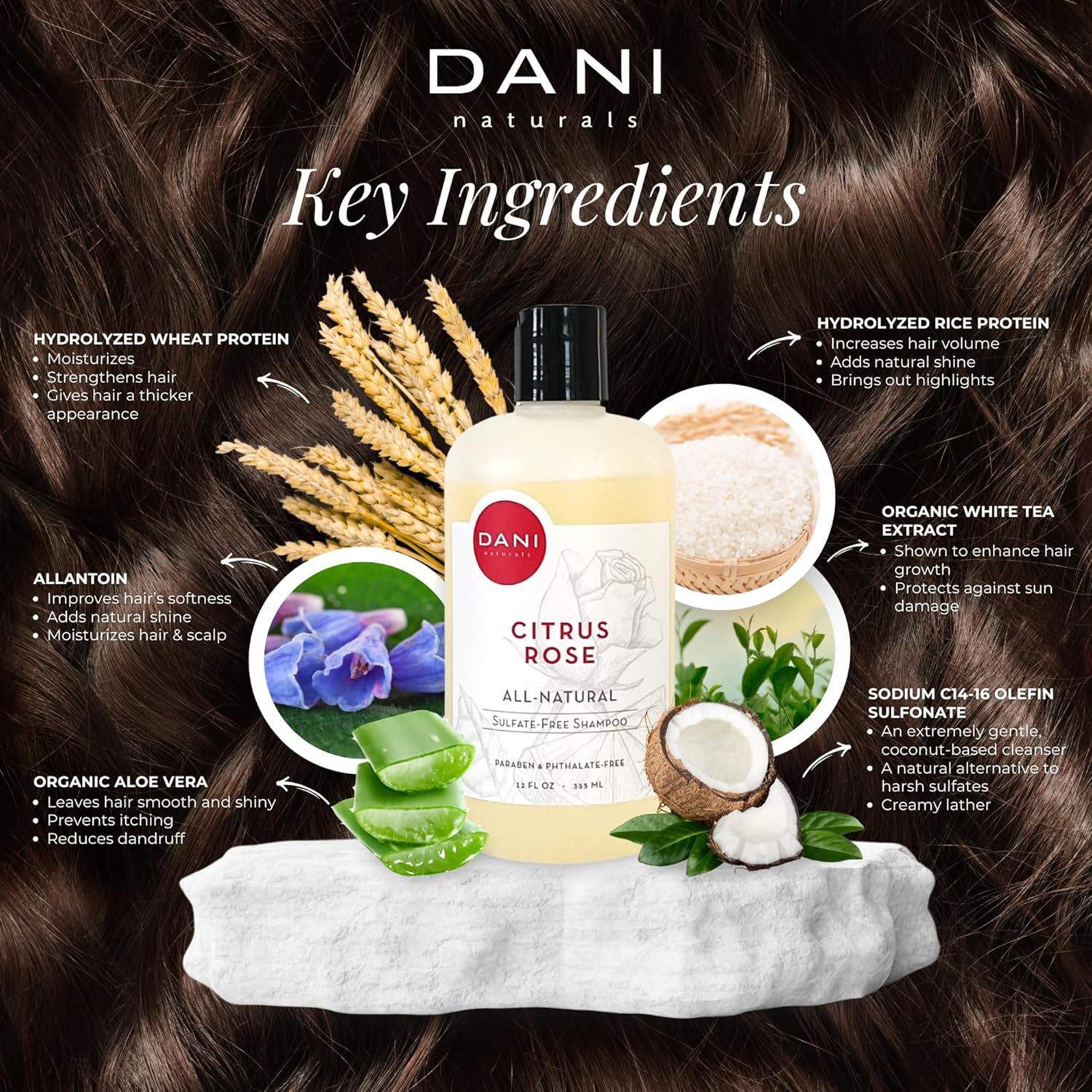 DANI Naturals Shampoo - Citrus Rose Scent is a sulfate-free, vegan, and organic shampoo that deeply moisturizes and nourishes all hair types, including color-treated hair