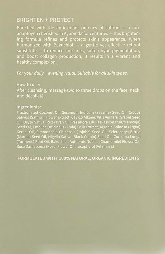 - RADIANT GLOW : Saffron is known for its brightening abilities, helping to reduce dullness and revitalize tired-looking skin. This skincare serum promotes an even skin tone and enhances your natural luminosity, ensuring that your complexion appears vibrant and refreshed. It’s perfect for those seeking a youthful, radiant glow in their skincare routine.