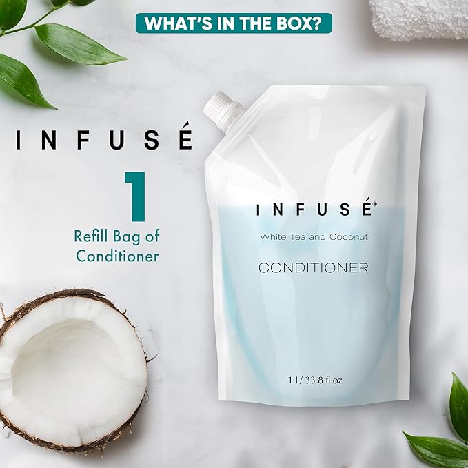 - HOTEL-QUALITY, LUXURIOUS AMENITIES: Enhance your guest experience with the Infuse White Tea and Coconut in a convenient 1-Liter Refill Bag, designed to refill wall-mounted and stand-alone dispensers. Enriched with white tea, coconut, organic aloe, and olive oil, this gentle, daily-use formula suits sensitive skin and hair. Ideal for hotels, vacation rentals, guest bathrooms, and homes, these premium amenities add sophistication and functionality