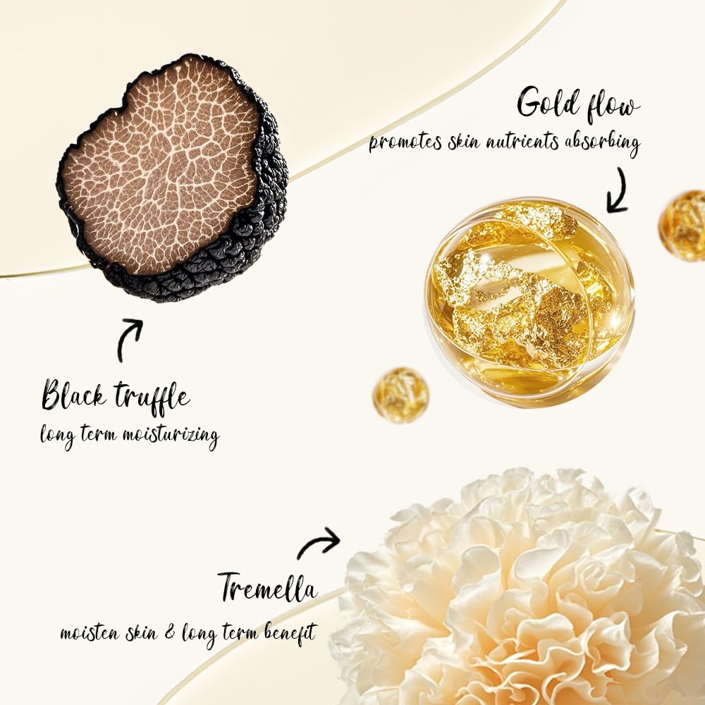 - PRECIOUS INGREDIENTS FOR YOUR SKIN: 24K pure gold foil is specially added to establish a strong and healthy skin to promote nutrient penetration. Blue truffle essence increases skin moisture content by 33% and has a continuous moisturizing effect. Tremella extract moisture your skin and has antioxdant effects.