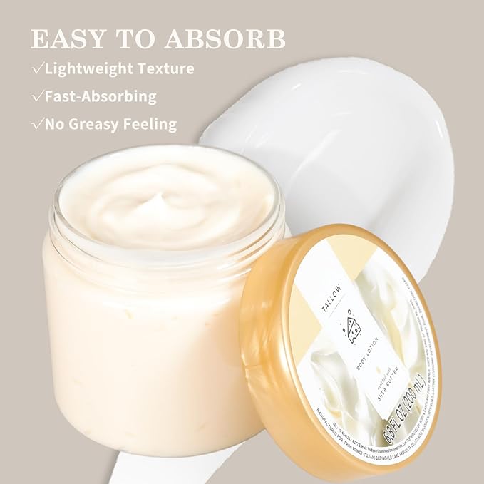 - EASY TO ABSORB: The Tallow Body Lotion has a fast absorbing, non greasy formula that can be quickly absorbed into the skin without leaving any greasy or viscous residues, providing hydration for a whole day. Let you enjoy the convenience of body lotion without leaving any greasy feeling.